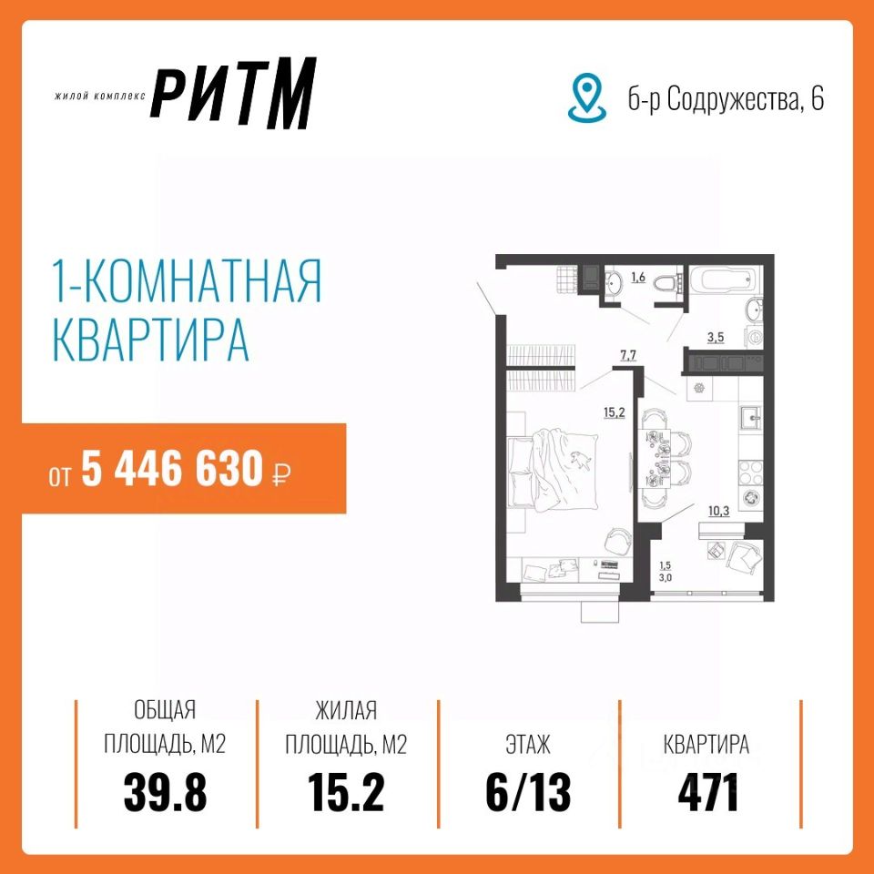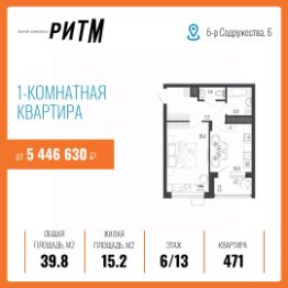ЖК "РИТМ" — ДОСТУПНАЯ И ВЫГОДНАЯ ИНВЕСТИЦИЯ В ВАШЕ БУДУЩЕЕ Жилой комплекс "Ритм" по ул. Бульвар Содружества уч. 6 — часть масштабного проекта развития территории воронежского левобережья — микрорайона "Ключи", который займет 28,6 га недалеко от въезда в город по тамбовскому направлению. Здесь строится инновационный красивый мини-город. Он насыщен социальной и коммерческой инфраструктурой и обеспечен новейшими коммуникациями. Комплекс состоит не только из качественных домов. Решения по благоустройству стимулируют ведение активного здорового образа жизни. Продуманы возможности для взаимодействия людей, их творческой самореализации, выстраивания добрососедских связей и формирования современного приятного комьюнити. И все это на благоприятном экологическом фоне. Это действительно новый шаг в создании привлекательной среды для жизни в современном ритме! Жить, не ограничивая себя и свою семью, — разве не об этом вы мечтали? Вас ждет инновационное пространство, где вы будете вести свою насыщенную и интересную жизнь в выбранном вами ритме. Подземный паркинг на -1 этаже вместимостью на 114 машино-места, в том числе семейные парковки на два автомобиля освобождает двор от машин — там гораздо приятнее гулять с детьми или заниматься спортом. Жители смогут выходить к своему автомобилю в теплый паркинг прямо из лифта — нет беспокойства из-за погодных условий или за сохранность транспортного средства. Ваши гости тоже не останутся без парковки — на придомовой территории организовано - 131 место и вне придомовой территории - 213 мест. Для абсолютного комфорта на -1 этаже в каждой секции расположены кладовые помещение площадью от 2,10 до 5,0 кв.м., где можно хранить все что угодно — велосипеды, санки, лыжи и прочие вещи. Они больше не будут занимать весь балкон. Там гораздо приятнее пить кофе и любоваться видом из окна. ИНФРАСТРУКТУРА и ПРЕИМУЩЕСТВА Инновационное жилье в ЖК "Ритм" совсем рядом — 5 минут до Остужевского кольца, 20 минут до центра, рядом новая транспортная развязка. Легко добраться до работы и вузов, на концерт или в гости. Первый цифровой квартал в городе Дворы без машин Подземный паркинг и кладовые (в каждой секции) Сервисная Управляющая Компания (Smile) Новая инфраструктура района и коммуникаций Рядом с вами: новая уже действующая школа - 3 минут (просто перейти дорогу) новый детский сад (проект на стадии разработки, ориентировочный срок сдачи конец 2026 года) - 5 минут (просто перейти дорогу) 5 минут от центральной площади событий и прогулочных аллей стадион и спортивные площадки поликлиника (проект на стадии разработки) магазины аптеки детские площадки