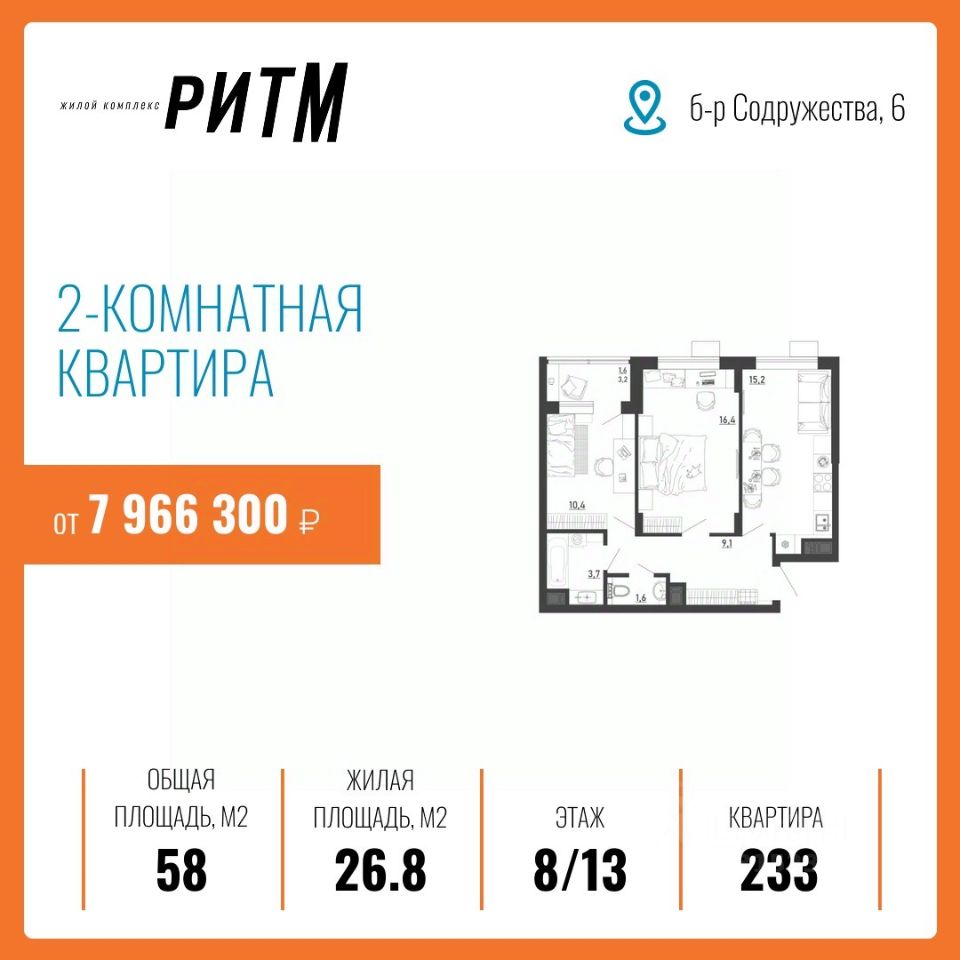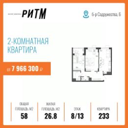 ЖК "РИТМ" — ДОСТУПНАЯ И ВЫГОДНАЯ ИНВЕСТИЦИЯ В ВАШЕ БУДУЩЕЕ Жилой комплекс "Ритм" по ул. Бульвар Содружества уч. 6 — часть масштабного проекта развития территории воронежского левобережья — микрорайона "Ключи", который займет 28,6 га недалеко от въезда в город по тамбовскому направлению. Здесь строится инновационный красивый мини-город. Он насыщен социальной и коммерческой инфраструктурой и обеспечен новейшими коммуникациями. Комплекс состоит не только из качественных домов. Решения по благоустройству стимулируют ведение активного здорового образа жизни. Продуманы возможности для взаимодействия людей, их творческой самореализации, выстраивания добрососедских связей и формирования современного приятного комьюнити. И все это на благоприятном экологическом фоне. Это действительно новый шаг в создании привлекательной среды для жизни в современном ритме! Жить, не ограничивая себя и свою семью, — разве не об этом вы мечтали? Вас ждет инновационное пространство, где вы будете вести свою насыщенную и интересную жизнь в выбранном вами ритме. Подземный паркинг на -1 этаже вместимостью на 114 машино-места, в том числе семейные парковки на два автомобиля освобождает двор от машин — там гораздо приятнее гулять с детьми или заниматься спортом. Жители смогут выходить к своему автомобилю в теплый паркинг прямо из лифта — нет беспокойства из-за погодных условий или за сохранность транспортного средства. Ваши гости тоже не останутся без парковки — на придомовой территории организовано - 131 место и вне придомовой территории - 213 мест. Для абсолютного комфорта на -1 этаже в каждой секции расположены кладовые помещение площадью от 2,10 до 5,0 кв.м., где можно хранить все что угодно — велосипеды, санки, лыжи и прочие вещи. Они больше не будут занимать весь балкон. Там гораздо приятнее пить кофе и любоваться видом из окна. ИНФРАСТРУКТУРА и ПРЕИМУЩЕСТВА Инновационное жилье в ЖК "Ритм" совсем рядом — 5 минут до Остужевского кольца, 20 минут до центра, рядом новая транспортная развязка. Легко добраться до работы и вузов, на концерт или в гости. Первый цифровой квартал в городе Дворы без машин Подземный паркинг и кладовые (в каждой секции) Сервисная Управляющая Компания (Smile) Новая инфраструктура района и коммуникаций Рядом с вами: новая уже действующая школа - 3 минут (просто перейти дорогу) новый детский сад (проект на стадии разработки, ориентировочный срок сдачи конец 2026 года) - 5 минут (просто перейти дорогу) 5 минут от центральной площади событий и прогулочных аллей стадион и спортивные площадки поликлиника (проект на стадии разработки) магазины аптеки детские площадки