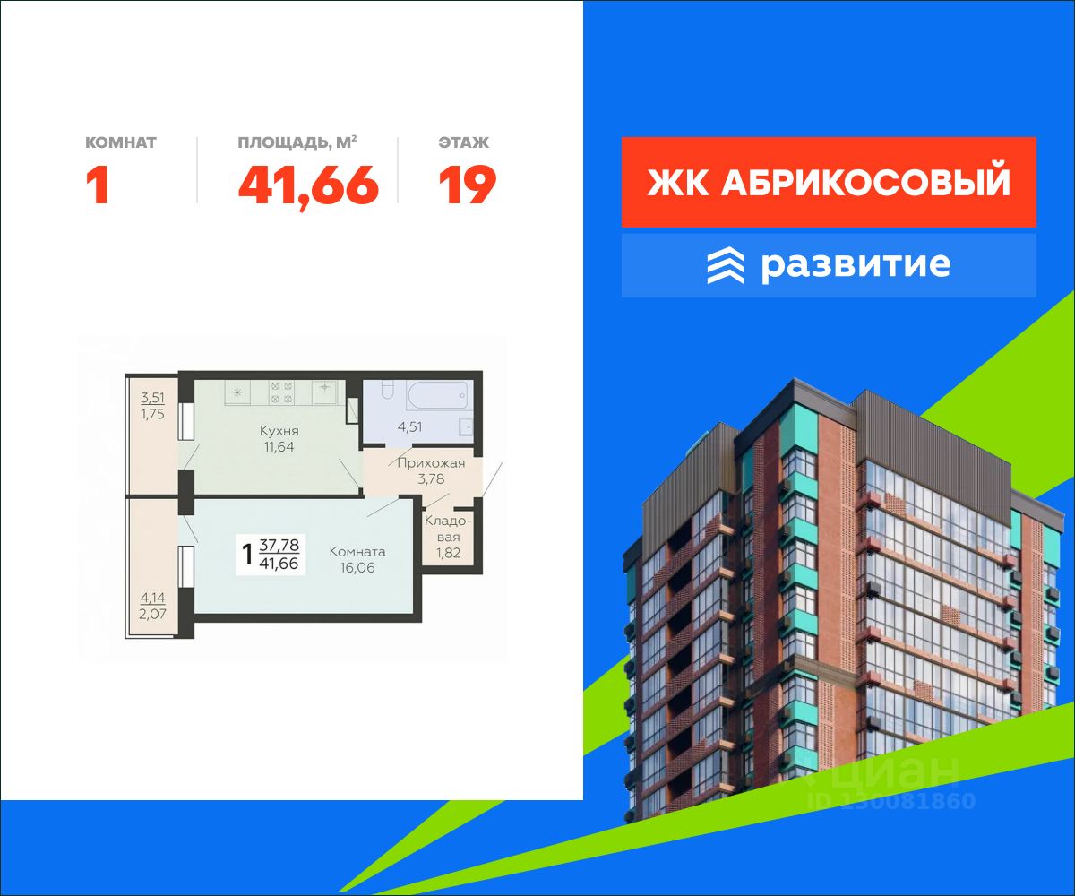 В продаже квартира площадью 41.66 кв. м с черновой отделкой. Квартира расположена на 19 этаже 19 этажного дома, в жилом комплексе комфорт-класса "Абрикосовый" (Застройщик - ГК "Развитие").