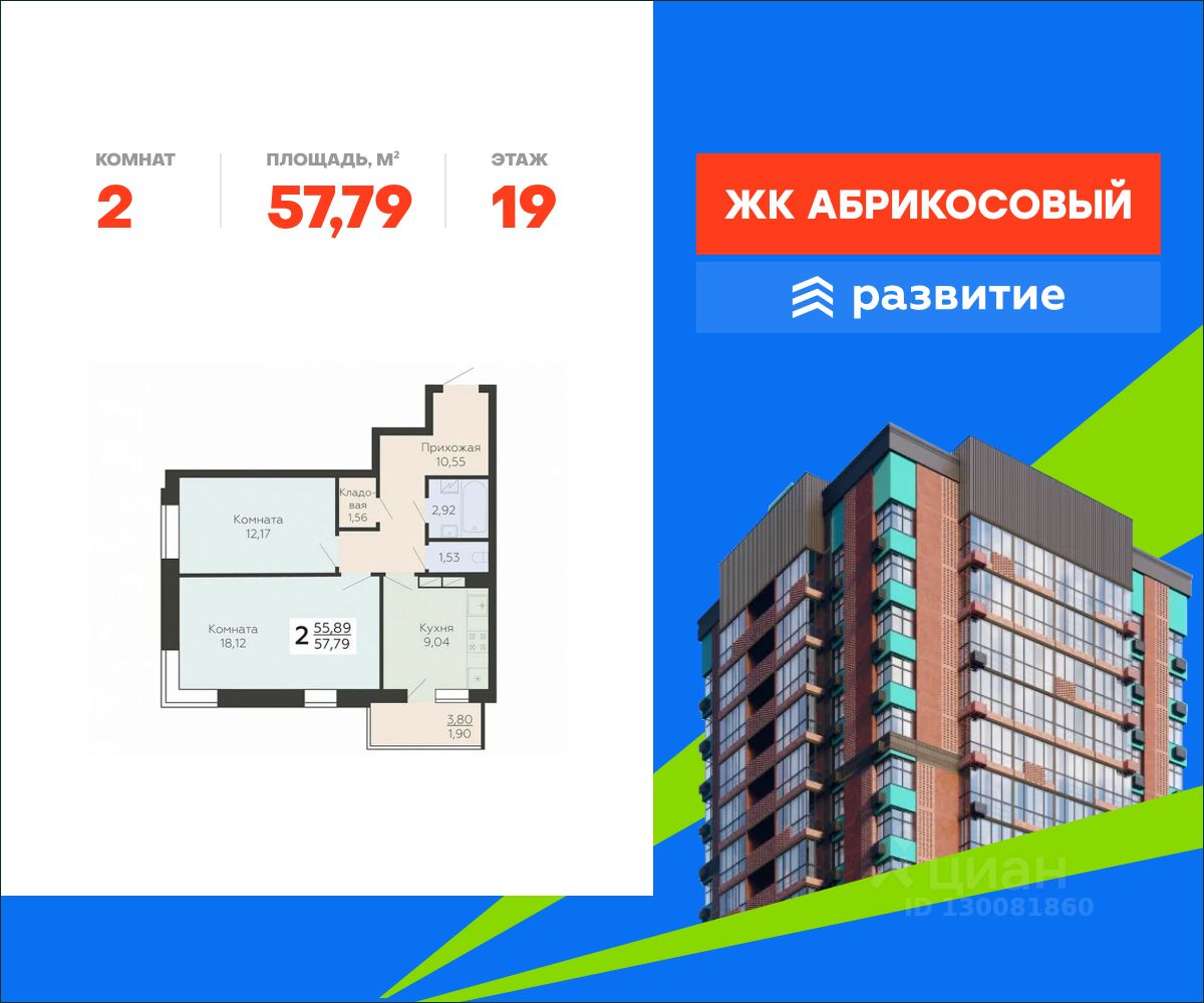 В продаже квартира площадью 57.79 кв. м с черновой отделкой. Квартира расположена на 19 этаже 19 этажного дома, в жилом комплексе комфорт-класса "Абрикосовый" (Застройщик - ГК "Развитие").