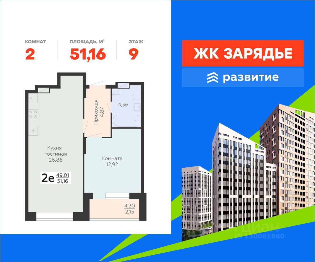 В продаже квартира площадью 51.16 кв. м с черновой отделкой. Квартира расположена на 9 этаже 15 этажного дома, в новом микрорайоне комфорт-класса "Зарядье" (Девелопер - ГК "Развитие").