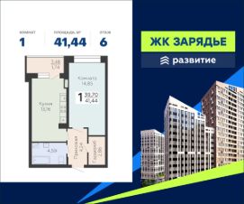 В продаже квартира площадью 41.44 кв. м с черновой отделкой. Квартира расположена на 6 этаже 18 этажного дома, в новом микрорайоне комфорт-класса "Зарядье" (Девелопер - ГК "Развитие").
