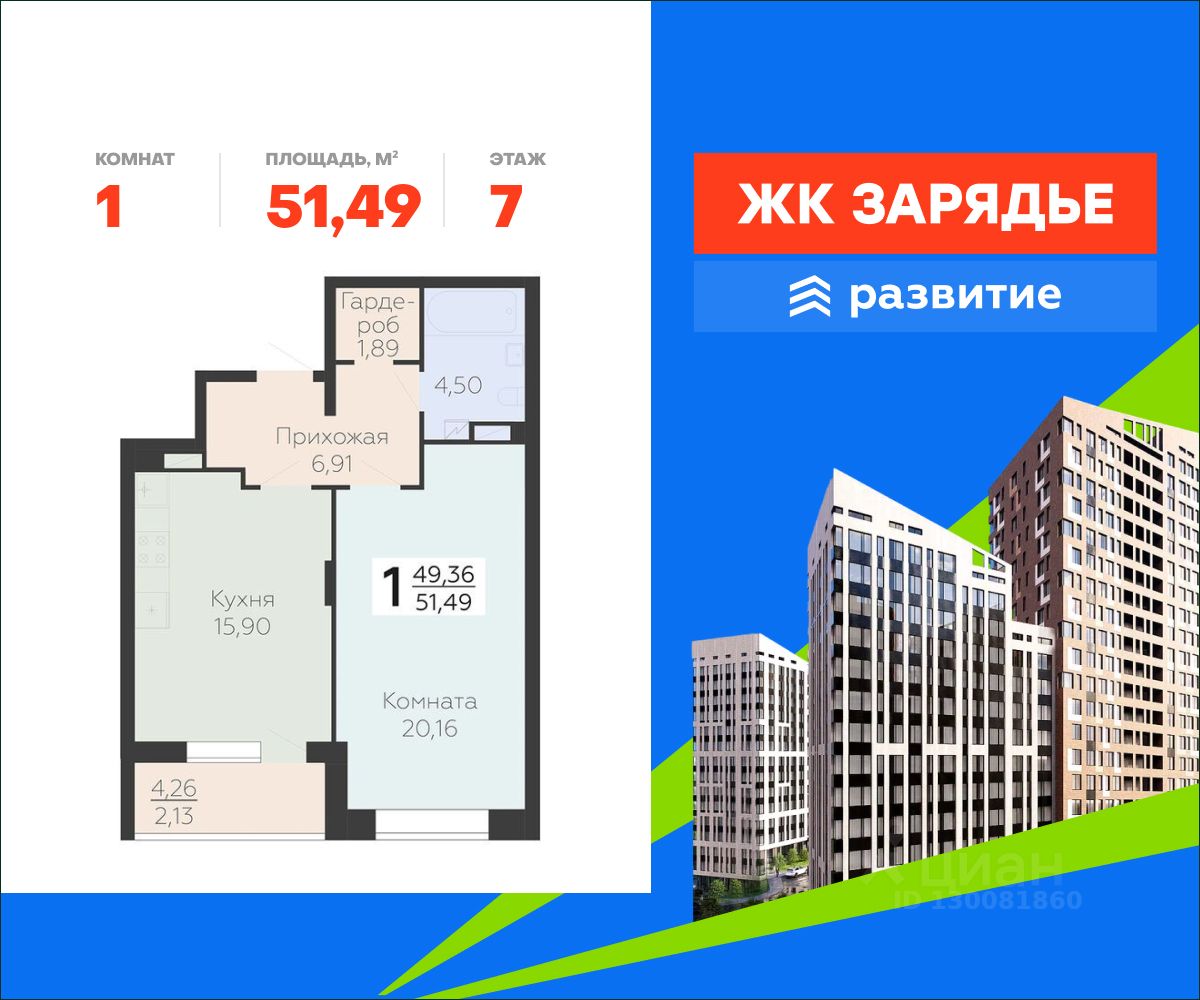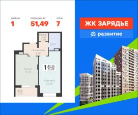 В продаже квартира площадью 51.49 кв. м с черновой отделкой. Квартира расположена на 7 этаже 21 этажного дома, в новом микрорайоне комфорт-класса "Зарядье" (Девелопер - ГК "Развитие").