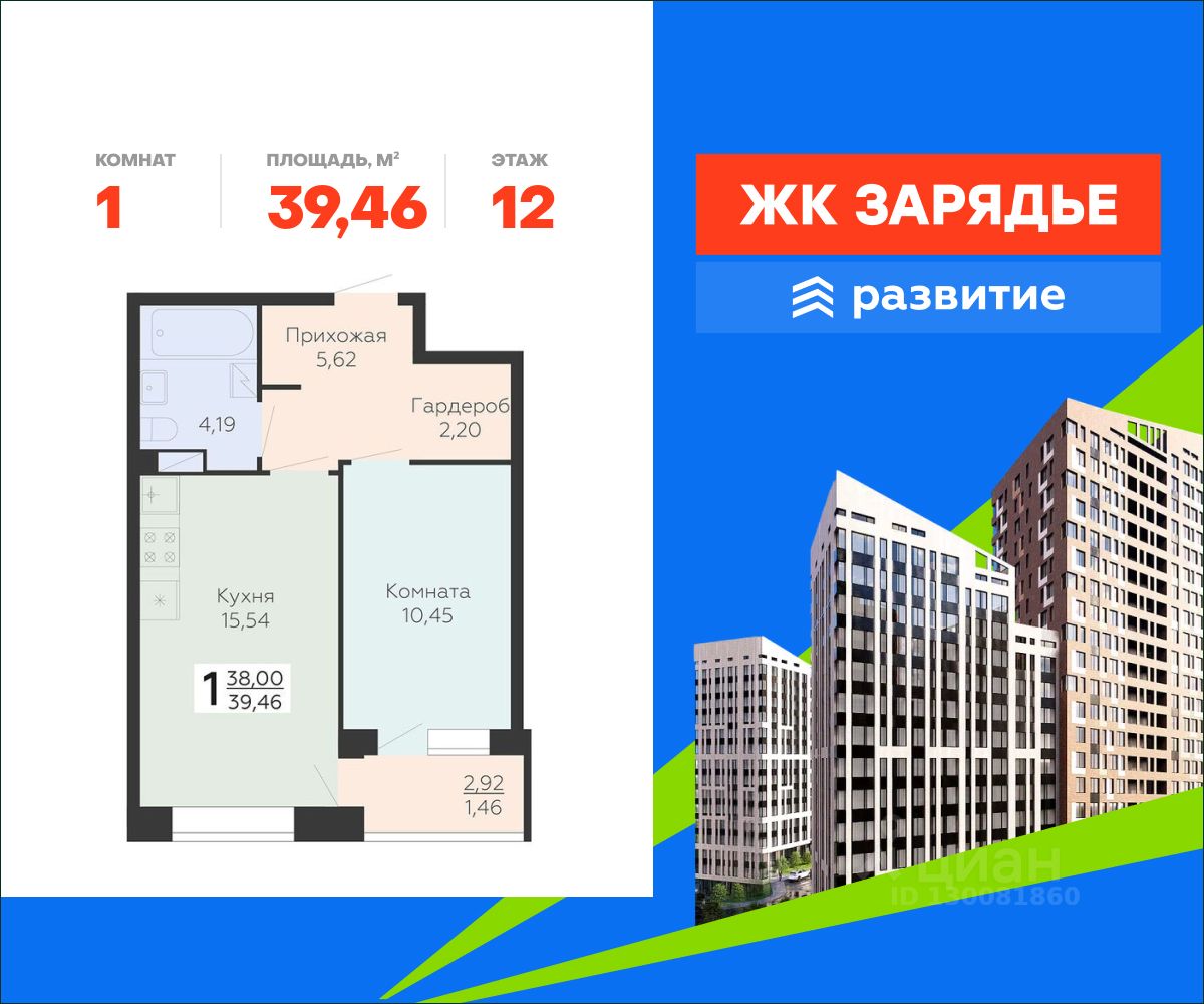 В продаже квартира площадью 39.46 кв. м с черновой отделкой. Квартира расположена на 12 этаже 15 этажного дома, в новом микрорайоне комфорт-класса "Зарядье" (Девелопер - ГК "Развитие").