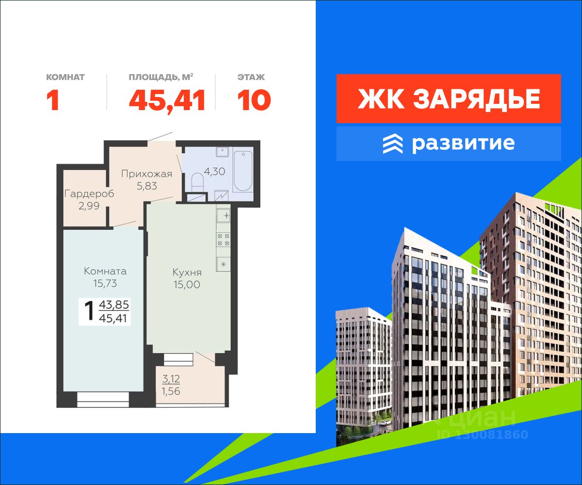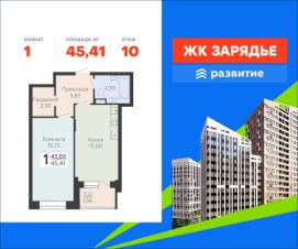 В продаже квартира площадью 45.41 кв. м с черновой отделкой. Квартира расположена на 10 этаже 18 этажного дома, в новом микрорайоне комфорт-класса "Зарядье" (Девелопер - ГК "Развитие").