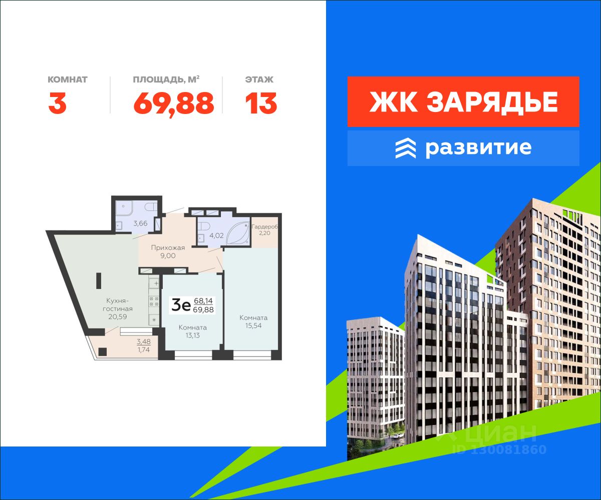 В продаже квартира площадью 69.88 кв. м с черновой отделкой. Квартира расположена на 13 этаже 18 этажного дома, в новом микрорайоне комфорт-класса "Зарядье" (Девелопер - ГК "Развитие").