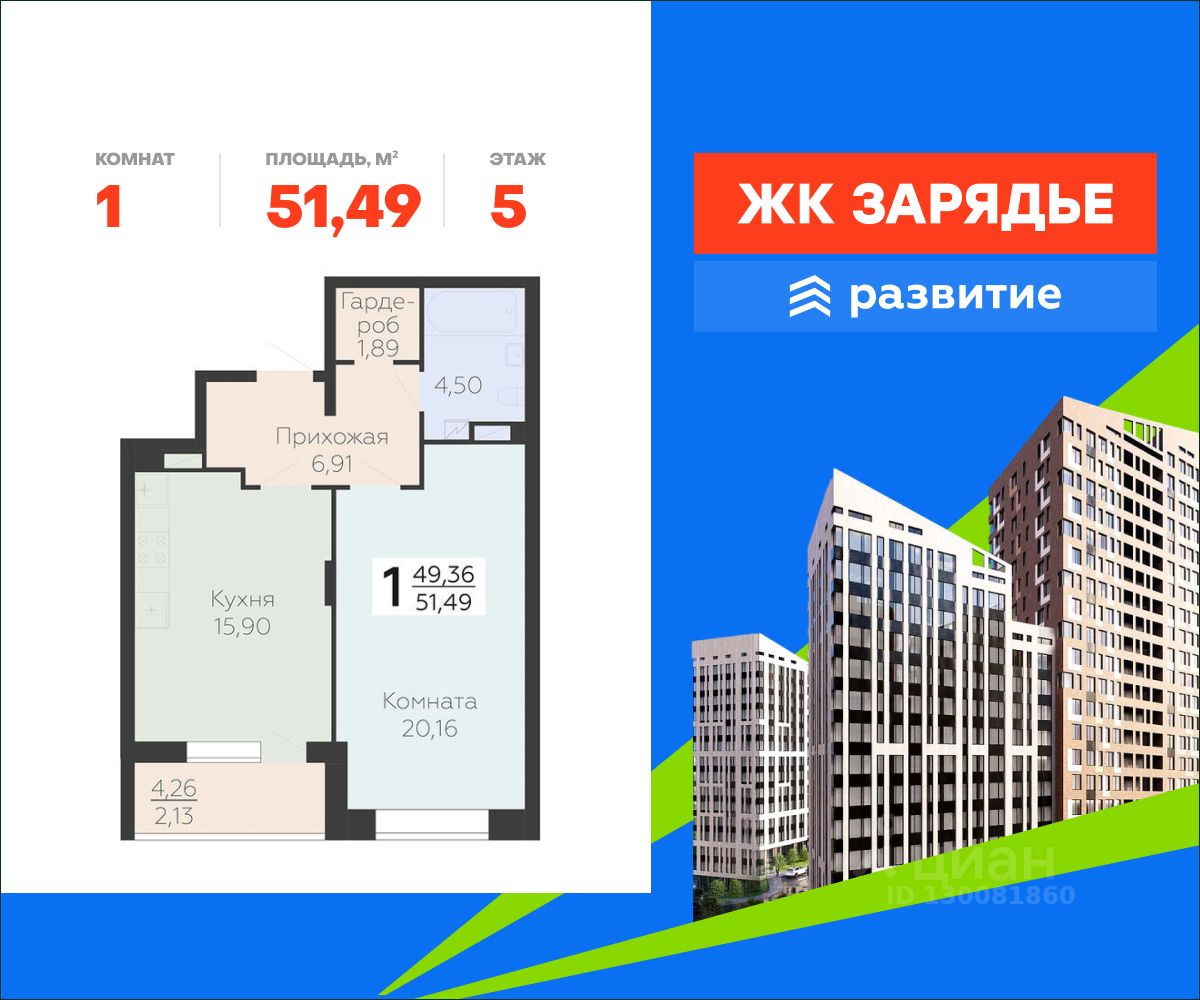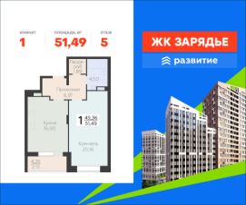 В продаже квартира площадью 51.49 кв. м с черновой отделкой. Квартира расположена на 5 этаже 21 этажного дома, в новом микрорайоне комфорт-класса "Зарядье" (Девелопер - ГК "Развитие").