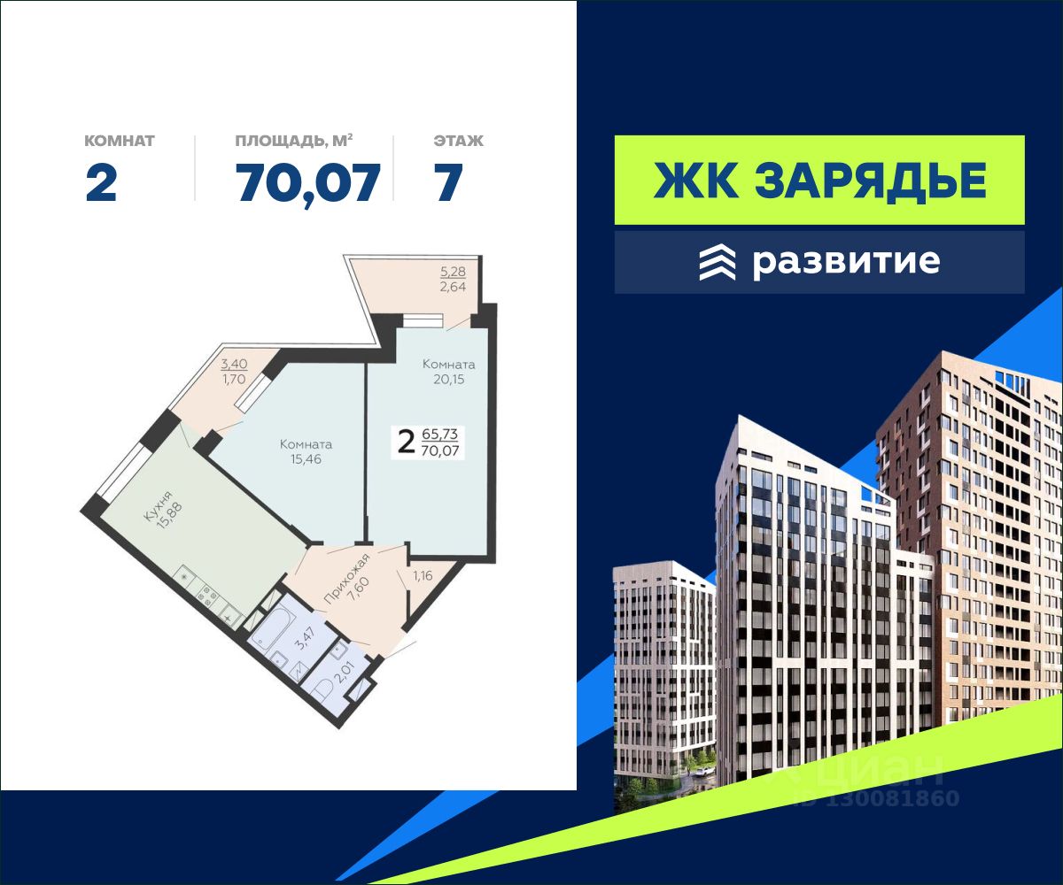 В продаже квартира площадью 70.07 кв. м с черновой отделкой. Квартира расположена на 7 этаже 18 этажного дома, в новом микрорайоне комфорт-класса "Зарядье" (Девелопер - ГК "Развитие").