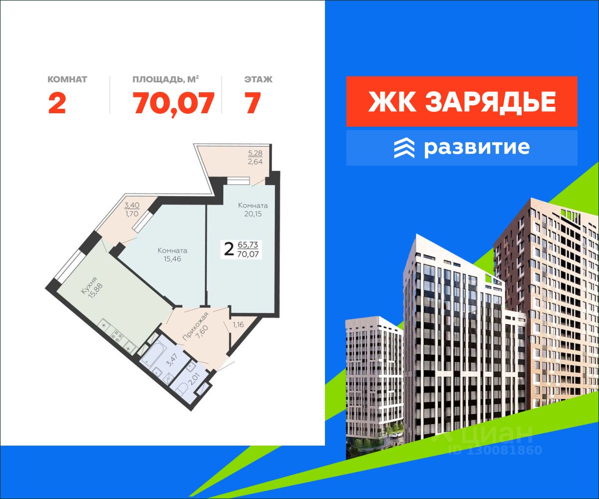 В продаже квартира площадью 70.07 кв. м с черновой отделкой. Квартира расположена на 7 этаже 18 этажного дома, в новом микрорайоне комфорт-класса "Зарядье" (Девелопер - федеральный застройщик ГК "Развитие").