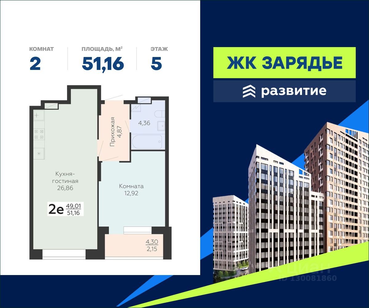 В продаже квартира площадью 51.16 кв. м с черновой отделкой. Квартира расположена на 5 этаже 15 этажного дома, в новом микрорайоне комфорт-класса "Зарядье" (Девелопер - ГК "Развитие").
