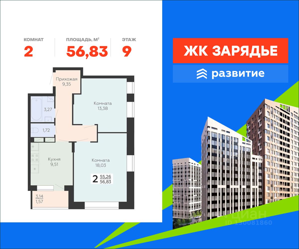 В продаже квартира площадью 56.83 кв. м с черновой отделкой. Квартира расположена на 9 этаже 15 этажного дома, в новом микрорайоне комфорт-класса "Зарядье" (Девелопер - федеральный застройщик ГК "Развитие").