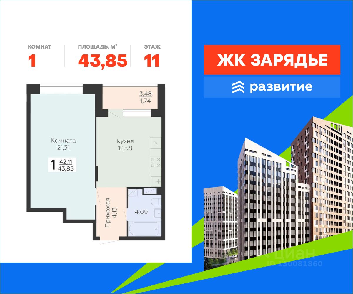 В продаже квартира площадью 43.85 кв. м с черновой отделкой. Квартира расположена на 11 этаже 15 этажного дома, в новом микрорайоне комфорт-класса "Зарядье" (Девелопер - ГК "Развитие").