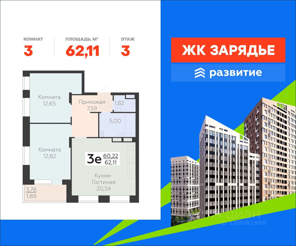 В продаже квартира площадью 62.11 кв. м с черновой отделкой. Квартира расположена на 3 этаже 21 этажного дома, в новом микрорайоне комфорт-класса "Зарядье" (Девелопер - федеральный застройщик ГК "Развитие").