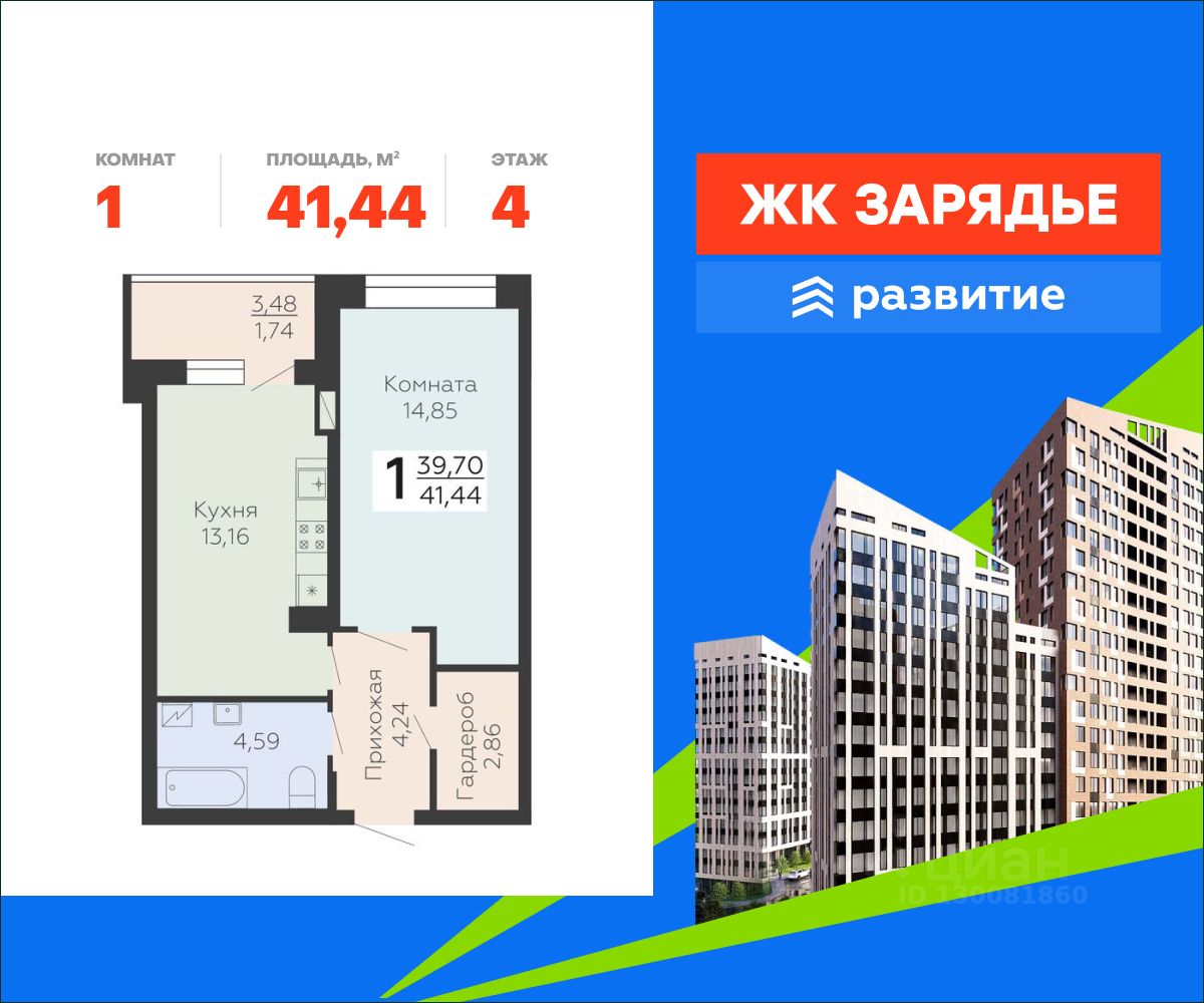 В продаже квартира площадью 41.44 кв. м с черновой отделкой. Квартира расположена на 4 этаже 18 этажного дома, в новом микрорайоне комфорт-класса "Зарядье" (Девелопер - федеральный застройщик ГК "Развитие").