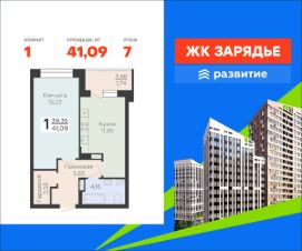 В продаже квартира площадью 41.09 кв. м с черновой отделкой. Квартира расположена на 7 этаже 18 этажного дома, в новом микрорайоне комфорт-класса "Зарядье" (Девелопер - ГК "Развитие").