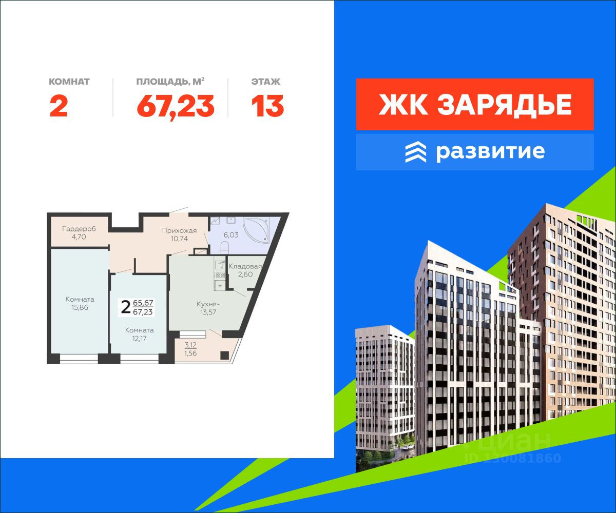 В продаже квартира площадью 67.23 кв. м с черновой отделкой. Квартира расположена на 13 этаже 18 этажного дома, в новом микрорайоне комфорт-класса "Зарядье" (Девелопер - ГК "Развитие").