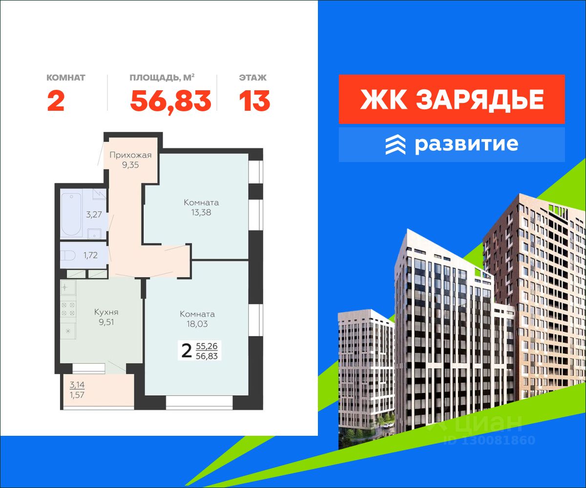В продаже квартира площадью 56.83 кв. м с черновой отделкой. Квартира расположена на 13 этаже 15 этажного дома, в новом микрорайоне комфорт-класса "Зарядье" (Девелопер - федеральный застройщик ГК "Развитие").