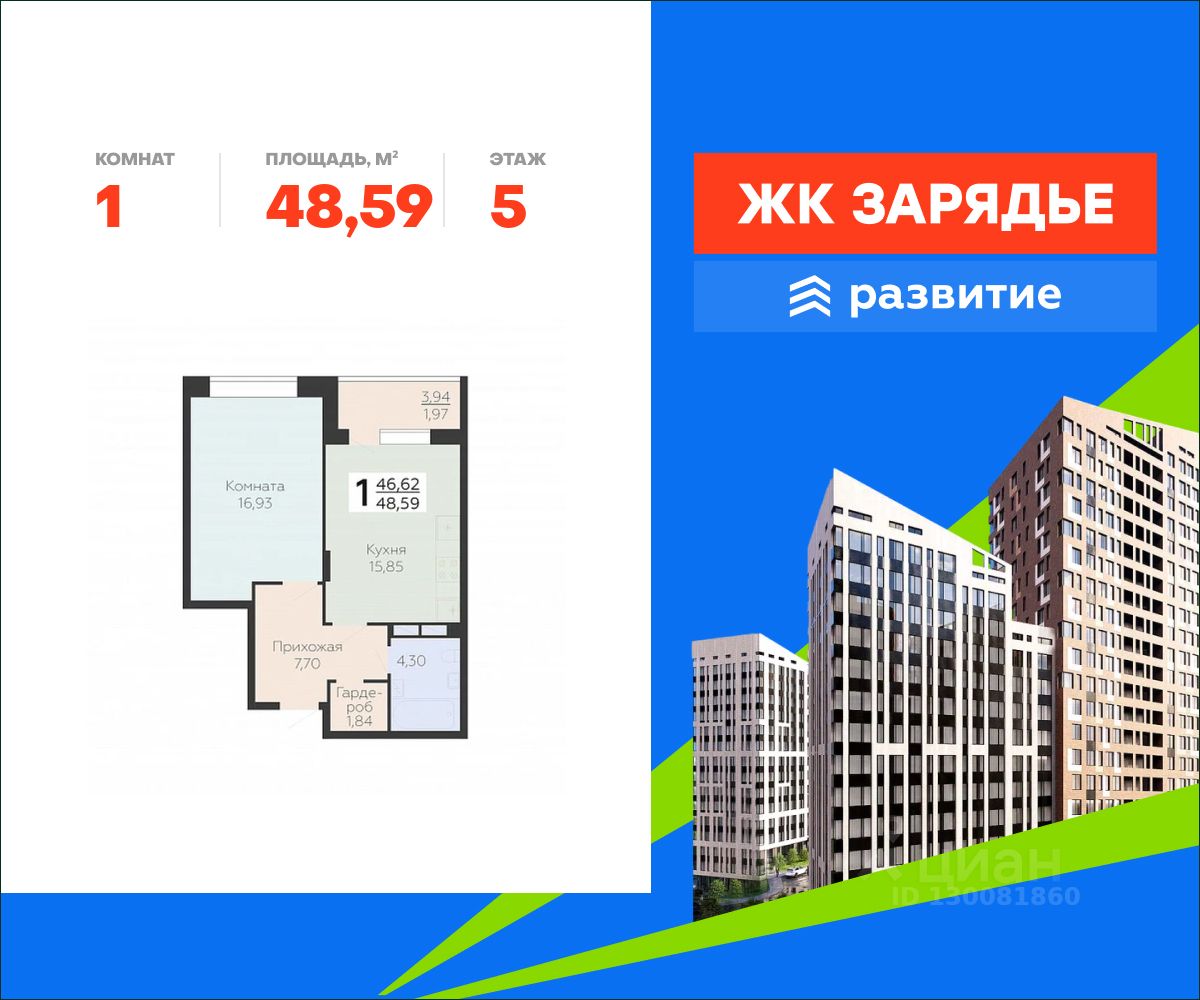 В продаже квартира площадью 48.59 кв. м с черновой отделкой. Квартира расположена на 5 этаже 21 этажного дома, в новом микрорайоне комфорт-класса "Зарядье" (Девелопер - ГК "Развитие").