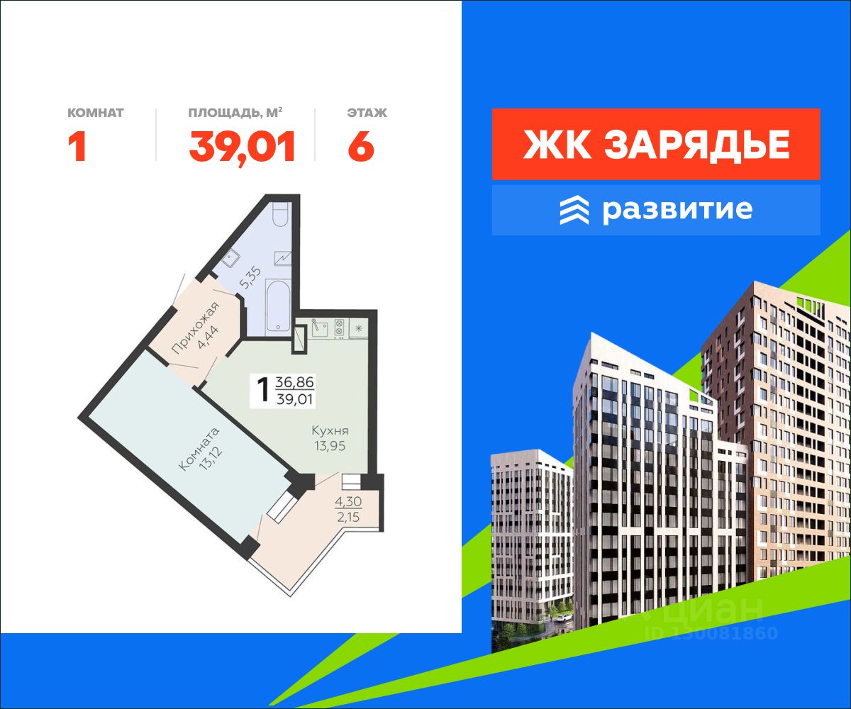 В продаже квартира площадью 39.01 кв. м с черновой отделкой. Квартира расположена на 6 этаже 18 этажного дома, в новом микрорайоне комфорт-класса "Зарядье" (Девелопер - ГК "Развитие").