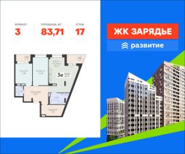 В продаже квартира площадью 83.71 кв. м с черновой отделкой. Квартира расположена на 17 этаже 18 этажного дома, в новом микрорайоне комфорт-класса "Зарядье" (Девелопер - ГК "Развитие").