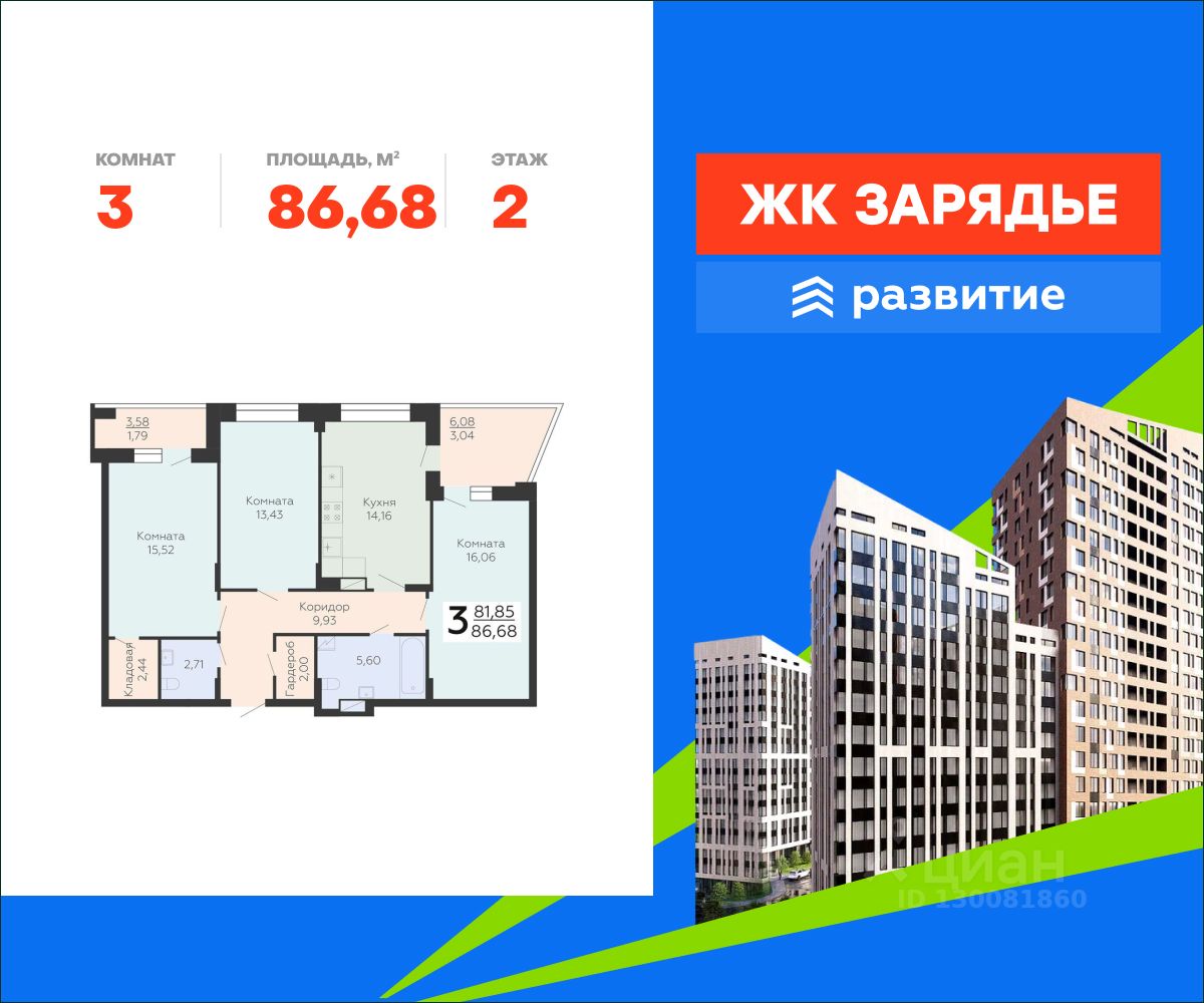 В продаже квартира площадью 86.68 кв. м с черновой отделкой. Квартира расположена на 2 этаже 23 этажного дома, в новом микрорайоне комфорт-класса "Зарядье" (Девелопер - ГК "Развитие").