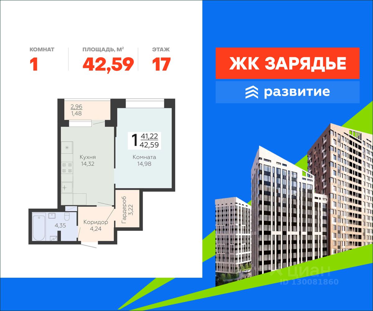 В продаже квартира площадью 42.59 кв. м с отделкой. Квартира расположена на 17 этаже 24 этажного дома, в новом микрорайоне комфорт-класса "Зарядье" (Девелопер - ГК "Развитие").