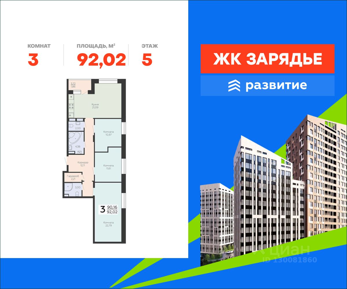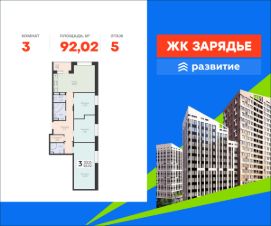 В продаже квартира площадью 92.02 кв. м с отделкой. Квартира расположена на 5 этаже 16 этажного дома, в новом микрорайоне комфорт-класса "Зарядье" (Девелопер - ГК "Развитие").