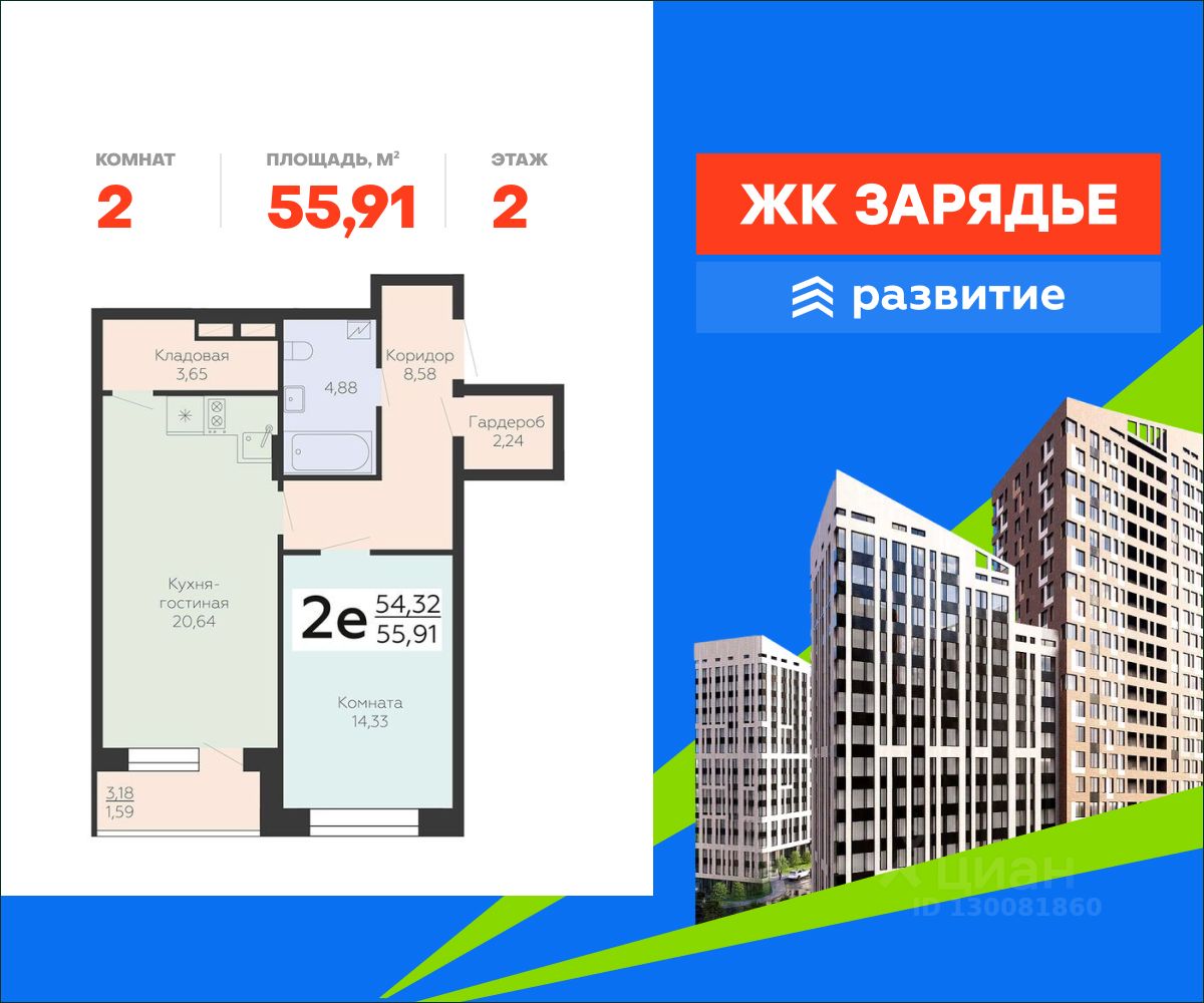 В продаже квартира площадью 55.91 кв. м с отделкой. Квартира расположена на 2 этаже 16 этажного дома, в новом микрорайоне комфорт-класса "Зарядье" (Девелопер - федеральный застройщик ГК "Развитие").