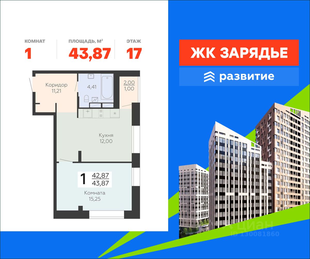 В продаже квартира площадью 43.87 кв. м с отделкой. Квартира расположена на 17 этаже 24 этажного дома, в новом микрорайоне комфорт-класса "Зарядье" (Девелопер - федеральный застройщик ГК "Развитие").