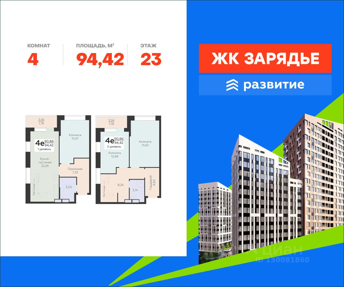 В продаже квартира площадью 94.42 кв. м с отделкой. Квартира расположена на 23 этаже 24 этажного дома, в новом микрорайоне комфорт-класса "Зарядье" (Девелопер - федеральный застройщик ГК "Развитие").