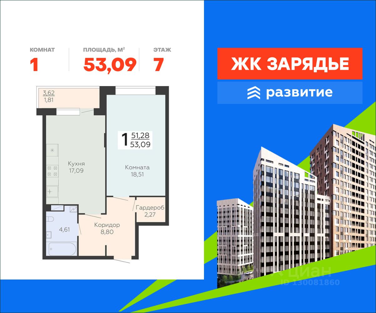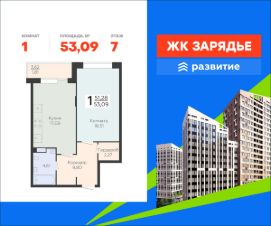 В продаже квартира площадью 53.09 кв. м с отделкой. Квартира расположена на 7 этаже 24 этажного дома, в новом микрорайоне комфорт-класса "Зарядье" (Девелопер - федеральный застройщик ГК "Развитие").