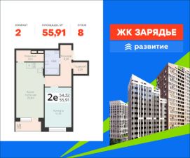 В продаже квартира площадью 55.91 кв. м с отделкой. Квартира расположена на 8 этаже 16 этажного дома, в новом микрорайоне комфорт-класса "Зарядье" (Девелопер - федеральный застройщик ГК "Развитие").