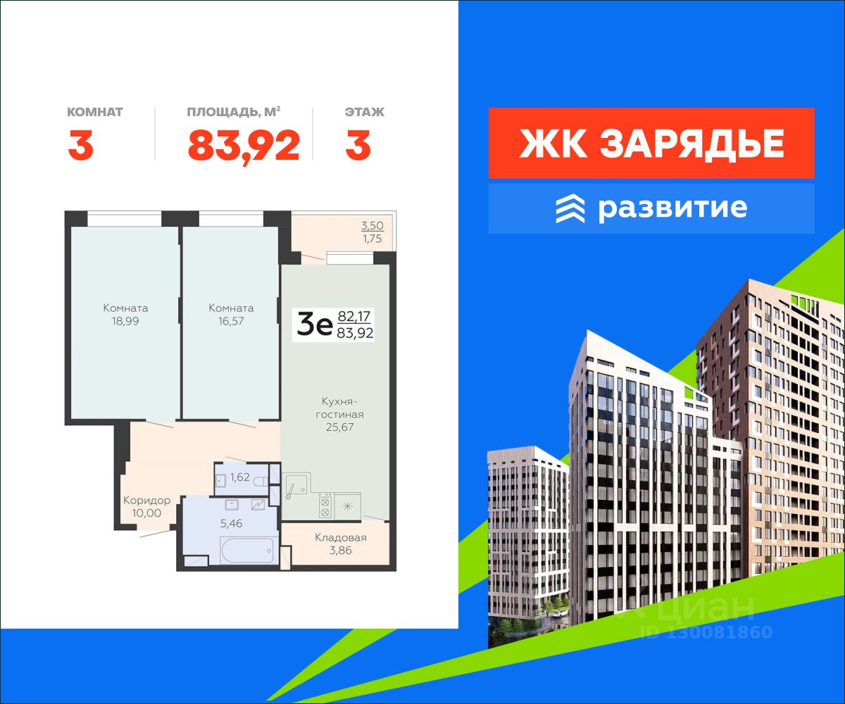 В продаже квартира площадью 83.92 кв. м с отделкой. Квартира расположена на 3 этаже 24 этажного дома, в новом микрорайоне комфорт-класса "Зарядье" (Девелопер - федеральный застройщик ГК "Развитие").