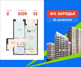 В продаже квартира площадью 57.19 кв. м с отделкой. Квартира расположена на 13 этаже 24 этажного дома, в новом микрорайоне комфорт-класса "Зарядье" (Девелопер - федеральный застройщик ГК "Развитие").