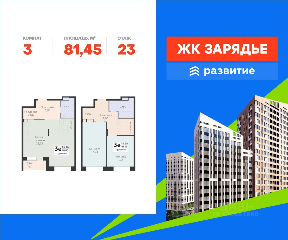 В продаже квартира площадью 81.45 кв. м с отделкой. Квартира расположена на 23 этаже 24 этажного дома, в новом микрорайоне комфорт-класса "Зарядье" (Девелопер - ГК "Развитие").