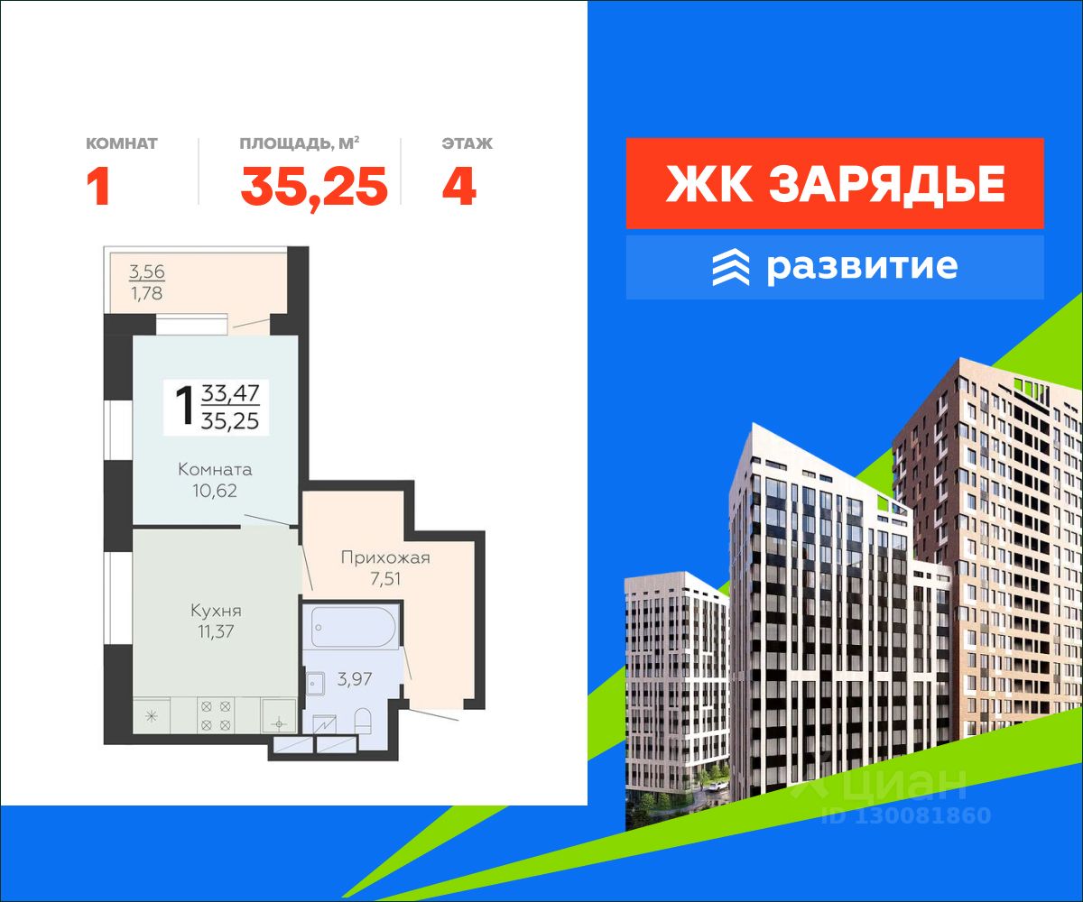 В продаже квартира площадью 35.25 кв. м с отделкой. Квартира расположена на 4 этаже 24 этажного дома, в новом микрорайоне комфорт-класса "Зарядье" (Девелопер - федеральный застройщик ГК "Развитие").