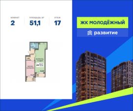 В продаже квартира площадью 51.10 кв. м с черновой отделкой. Квартира расположена на 17 этаже 19 этажного дома, в жилом комплексе "Молодежный" (Федеральный застройщик - ГК "Развитие").