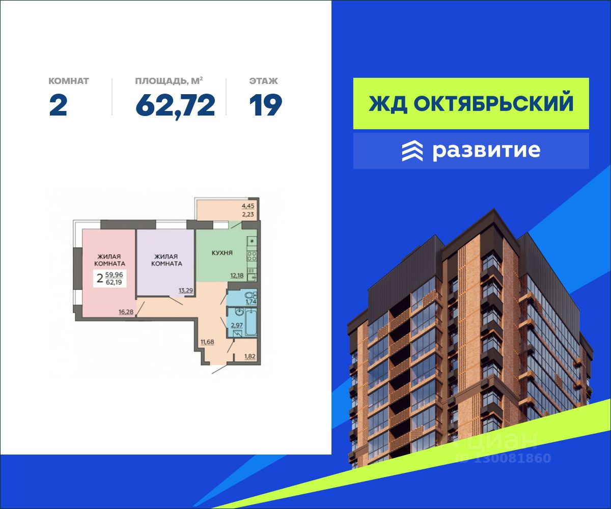 В продаже квартира площадью 62.72 кв. м с черновой отделкой. Квартира расположена на 19 этаже в 19-этажном жилом комплексе "Октябрьский".