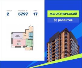 В продаже квартира площадью 57.97 кв. м с черновой отделкой. Квартира расположена на 17 этаже в 19-этажном жилом комплексе "Октябрьский".