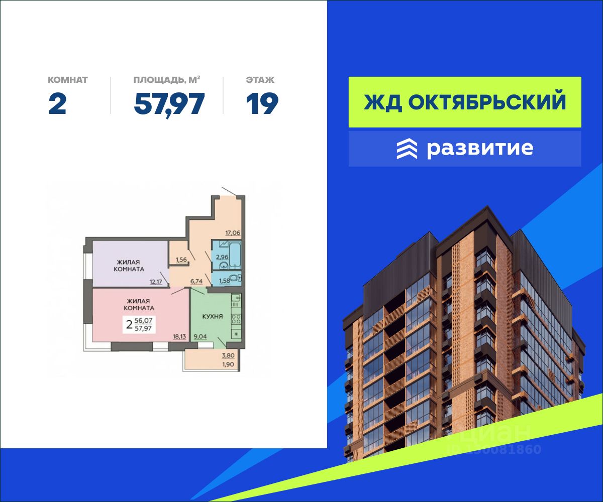 В продаже квартира площадью 57.97 кв. м с черновой отделкой. Квартира расположена на 19 этаже в 19-этажном жилом комплексе "Октябрьский".