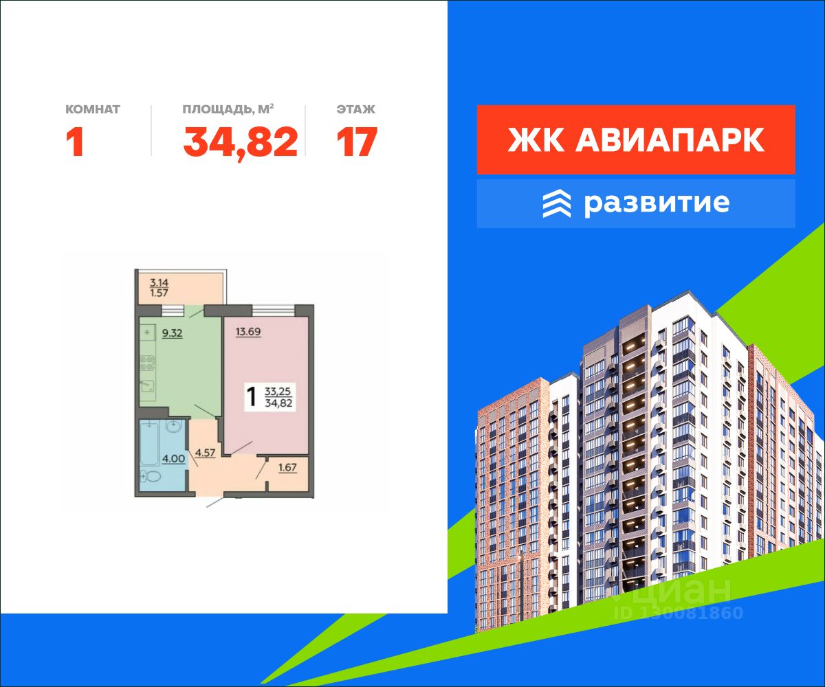 В продаже квартира площадью 34.82 кв. м с отделкой. Квартира расположена на 17 этаже 17 этажного дома, в новом жилом квартале "Авиапарк".