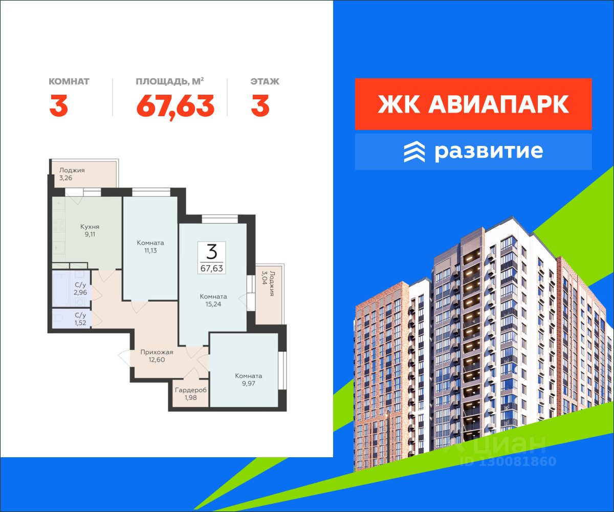 В продаже квартира площадью 67.63 кв. м с черновой отделкой. Квартира расположена на 3 этаже 19 этажного дома, в новом жилом квартале "Авиапарк".