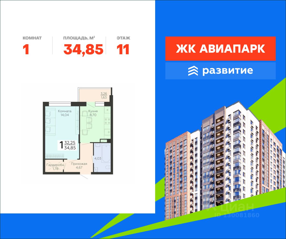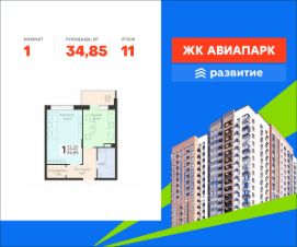 В продаже квартира площадью 34.85 кв. м с черновой отделкой. Квартира расположена на 11 этаже 15 этажного дома, в новом жилом квартале "Авиапарк".