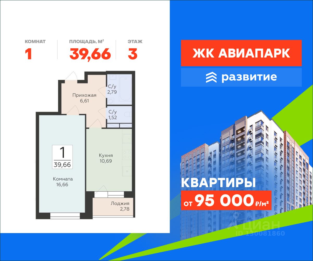 В продаже квартира площадью 39.66 кв. м с черновой отделкой. Квартира расположена на 3 этаже 15 этажного дома, в новом жилом квартале "Авиапарк".
