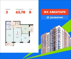 В продаже квартира площадью 65.78 кв. м с черновой отделкой. Квартира расположена на 8 этаже 19 этажного дома, в новом жилом квартале "Авиапарк".