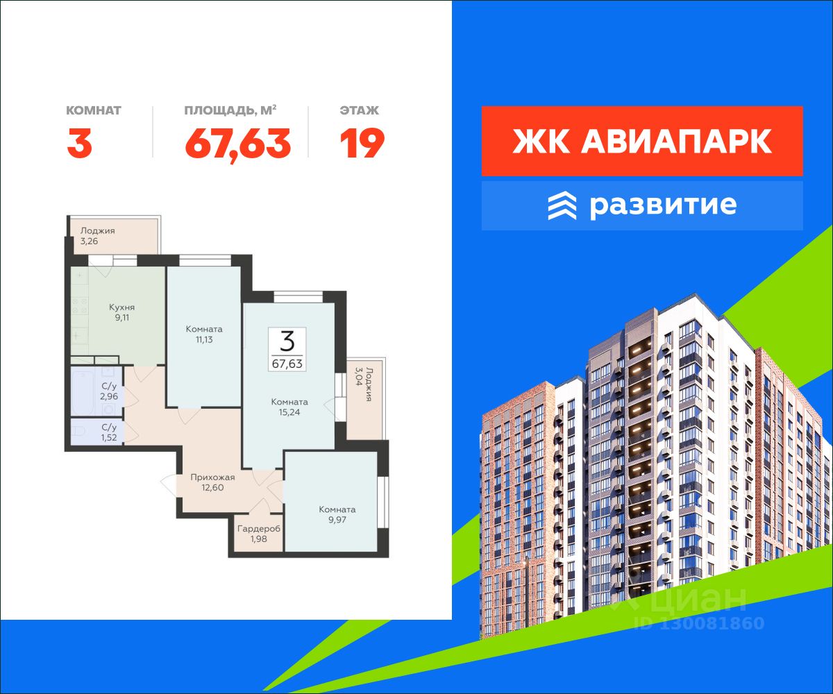 В продаже квартира площадью 67.63 кв. м с черновой отделкой. Квартира расположена на 19 этаже 19 этажного дома, в новом жилом квартале "Авиапарк".