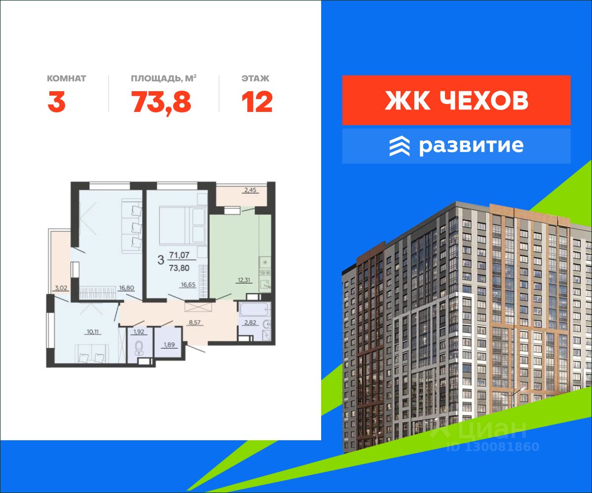Продается квартира площадью 73.80 кв. м без отделки. Квартира находится на 12 этаже 20 этажного дома, в жилом комплексе "Чехов". Комплекс расположен по адресу - г. Воронеж, ул. Богдана Хмельницкого д. 45а.