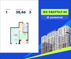 В продаже квартира площадью 38.46 кв. м с черновой отделкой отделкой. Квартира расположена на 3 этаже 18 этажного дома, в жилом комплексе комфорт-класса "Квартал 45".