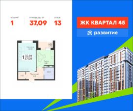 В продаже квартира площадью 37.09 кв. м с черновой отделкой. Квартира расположена на 13 этаже 18 этажного дома, в жилом комплексе комфорт-класса "Квартал 45".