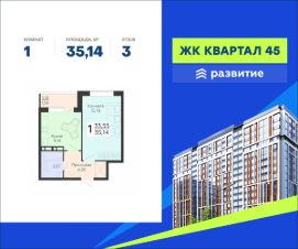 В продаже квартира площадью 35.14 кв. м с черновой отделкой отделкой. Квартира расположена на 3 этаже 18 этажного дома, в жилом комплексе комфорт-класса "Квартал 45".